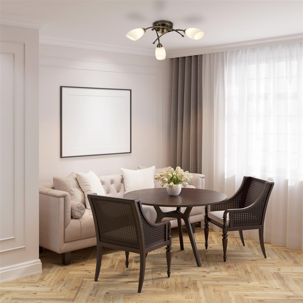 This Opera antique brass 3 Light Flush ceiling light with opal glass shades will look elegant in any living space. The traditional antique brass finish fitting has three beautifully shaped opal glass shades with curved stems, which provide a practical source of light for the entire room. Ideal for rooms with lower ceilings, due to its shallow depth, this flush is a simple way to add a finishing touch to any living room, bedroom or kitchen.