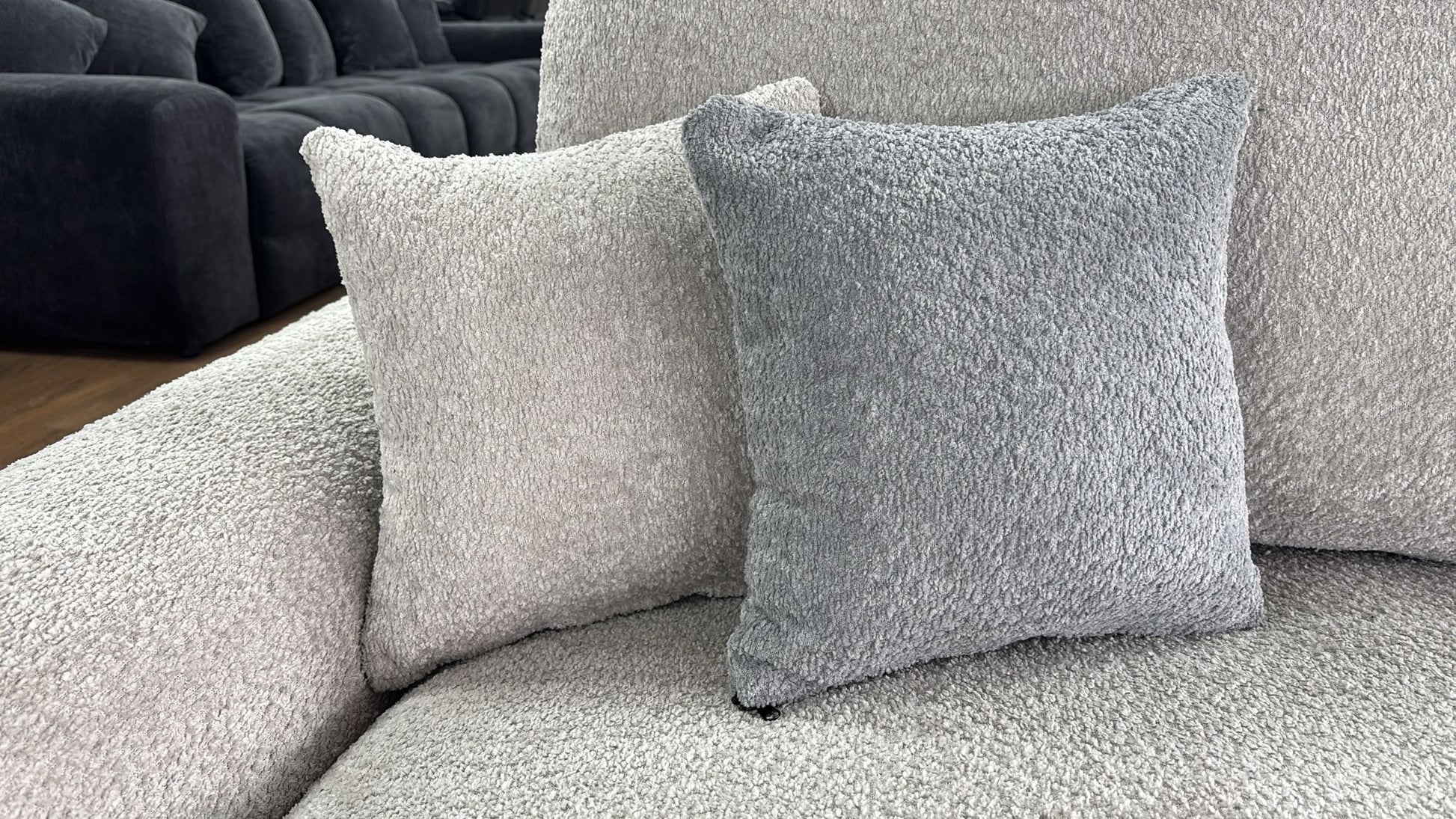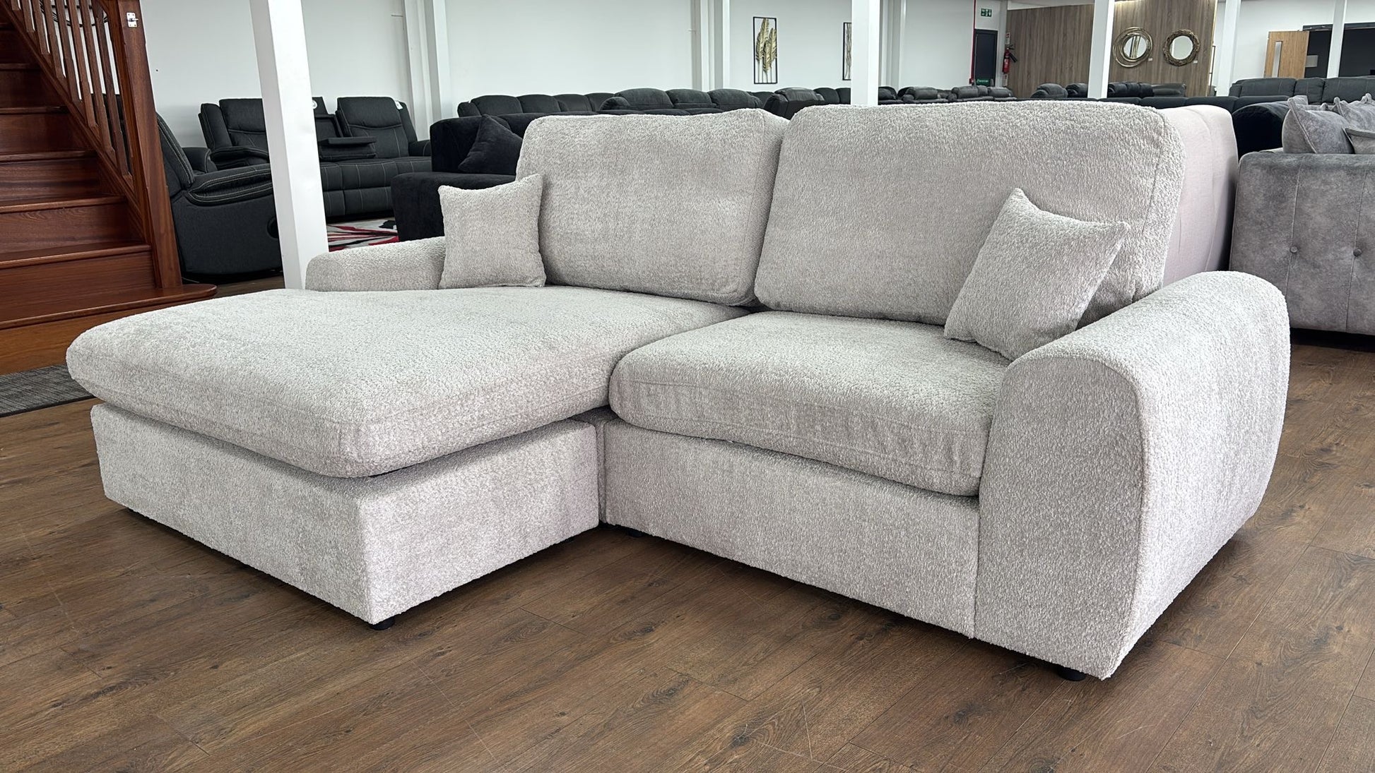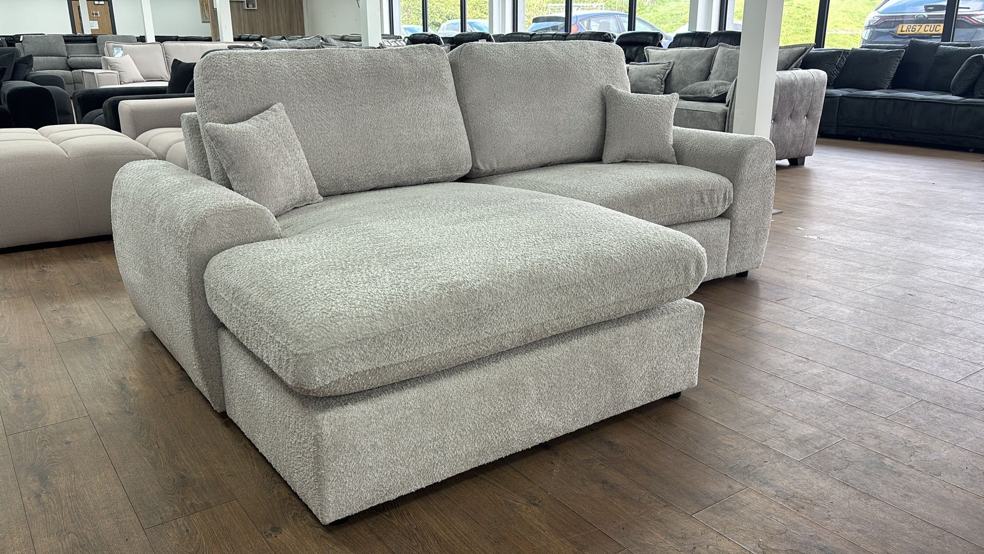 Get cosey with the all new Ashwin universal corner sofa + footstool. Available in silver & cream Boucle fabric.